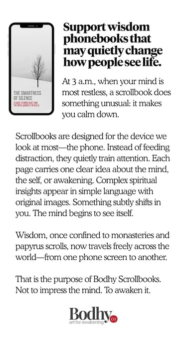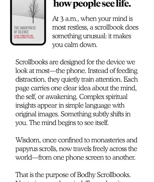Bodhy is a digital spiritual publishing house (SBNR) supported by The Bodhy Founder Circle. By becoming a member of The Circle, you are directly investing in our research and creation. Your Circle membership fees allows us to distribute our vertical, 25-page ‘Scrollbooks’ globally at no cost to the end user.