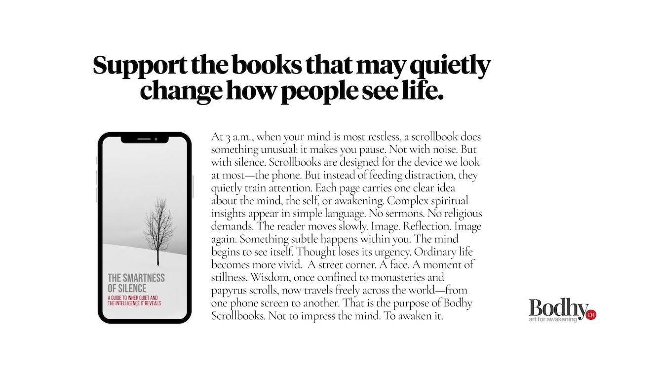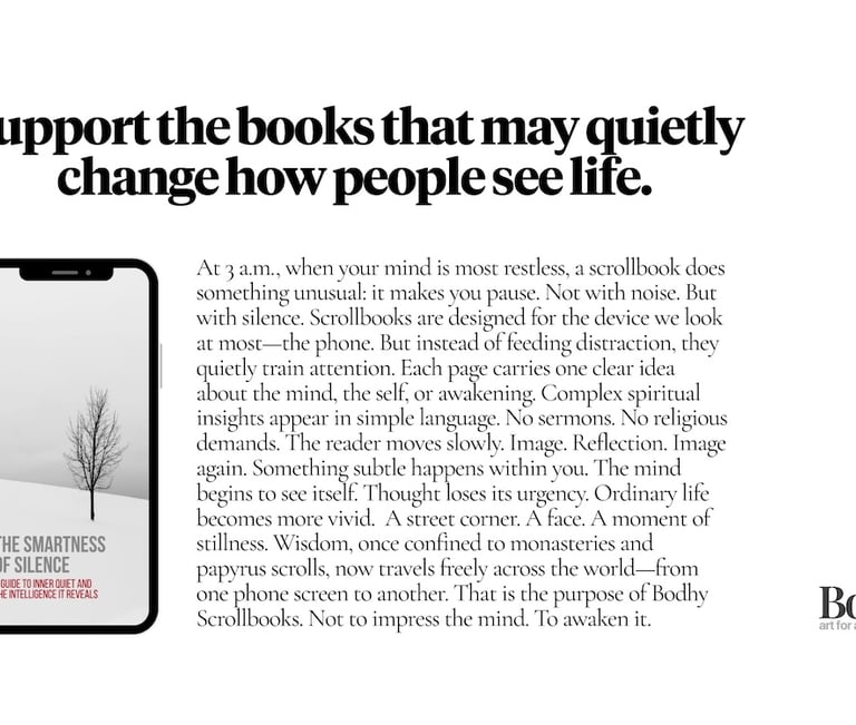 We are supported by The Bodhy Founder Circle members in India and abroad who believe contemplative art and awakening wisdom should be freely available. All members get a purchase payment invoice and bulk print copies of the book for their private distribution. Members can also place their business or service advertisements in Bodhy Scrollbooks.