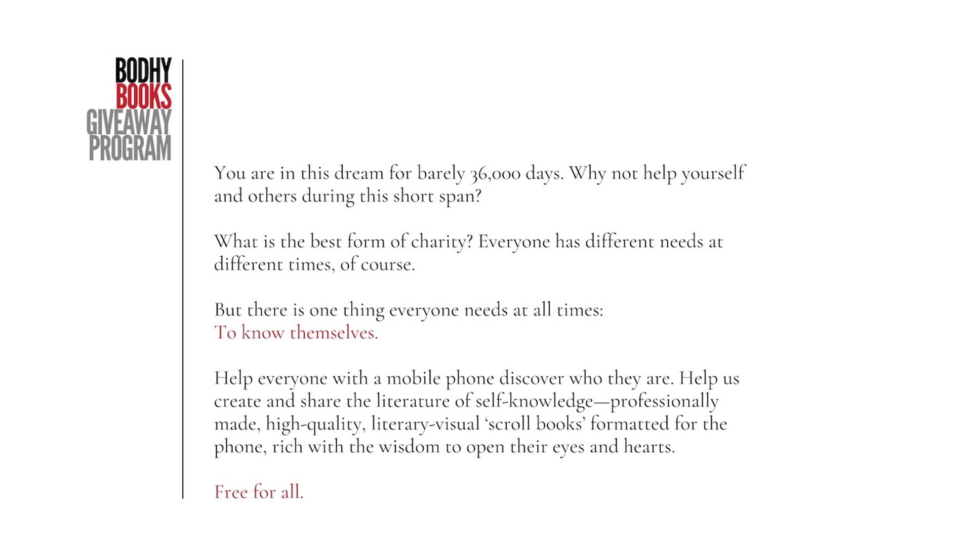 Help everyone with a mobile phone discover who they are. Help us create and share the literature of self-knowledge—professionally made, high-quality, literary-visual ‘scroll books’ formatted for the phone, rich with the wisdom to open their eyes and hearts.